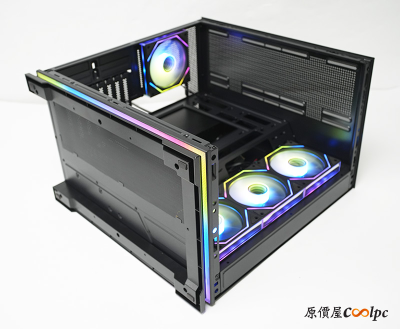 內部採用雙艙體結構,底部少了電源艙讓空間更寬敞,相對地帶來更高的相容性。主機板支援ATX/M-ATX/Mini-ITX規格,CPU散熱器高度165mm,顯卡長度420mm。側邊預裝3顆120mm ARGB風扇,後方也預裝1顆120mm ARGB風扇,頂部與底部最多都能擴充3顆120mm風扇,側邊與頂部都能安裝360mm大型水冷排,基本上現在主流的零件都能裝,想要大玩DIY都沒問題。