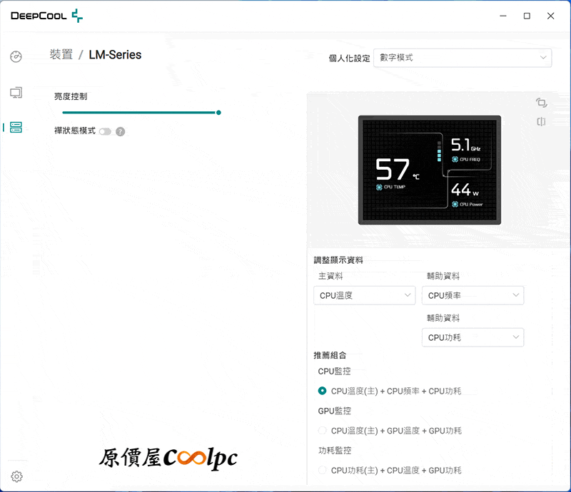回到 DeepCreative 軟體我還是介紹一下,軟體可以偵測基本的硬體資訊內容、狀態、使用量,最重要的是設定 DeepCool LM360 WH 水冷 2.4 吋 IPS 面板內容。