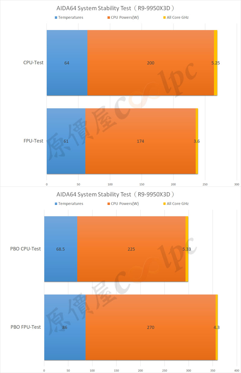 測試平台採用 AMD Ryzen 9 9950X3D 處理器,溫度測試使用 AIDA64 System Stability 進行 CPU/FPU 壓力測試。