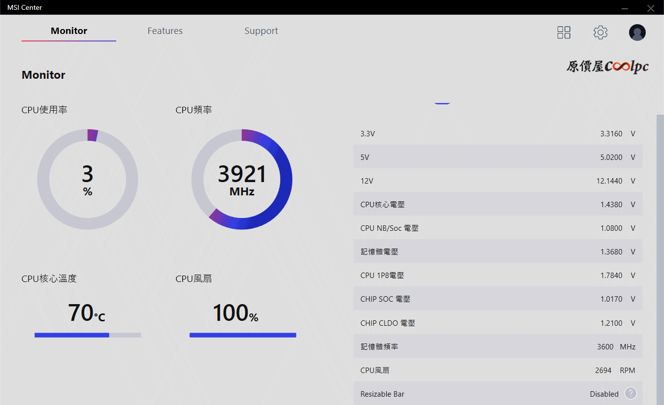 另外燈光效果的部分也可以在Features裡面點選Mystic Light,就能調整水冷上的RGB風扇,甚至同步周邊的燈光效果也是使用同樣軟體。