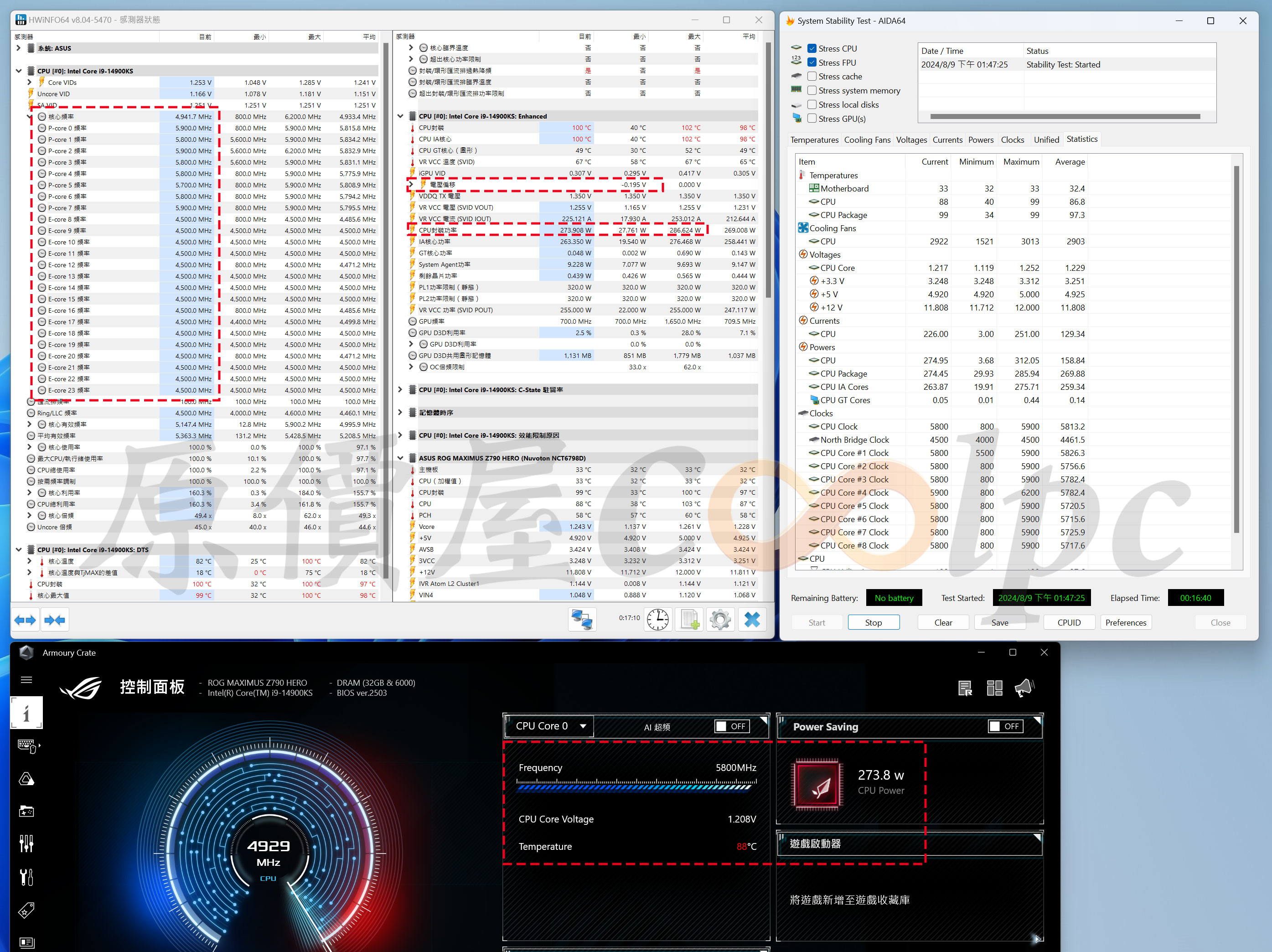 (點圖可放大)使用 Intel i9-14900ks 處理器,BIOS 更新到修復 0x129 Beta 版本,BIOS 為 Intel Default Settings 模式,預設模式下最大功耗高達 302W,平均功耗約279W,P 時脈分別來到 5.4/5.3/5.2Hz、E 時脈則是全核 4.3 GHz,溫度約 88 度。