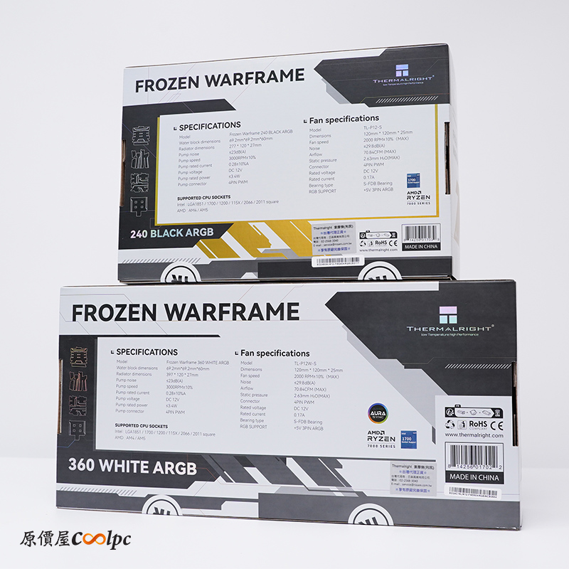 利民 Frozen Warframe 寒冰裝甲 240 /360 mm 一體式水冷系統有黑色跟白色可以選擇,小編拿到的開箱品是 240 黑色、360 白色版本,外盒上的水冷示意圖可以明確知道選擇的尺寸和顏色,搭載的風扇還是ARGB版本,冷頭直接採用LCD面板設計,能夠放靜態、動態,甚至影片都行!外盒背面後底下還有水冷詳細規格資訊和特色介紹;盒內保護措施做的相當不錯!上方有用一個紙版覆蓋水冷系統和配件,運送過程中能夠更穩固。