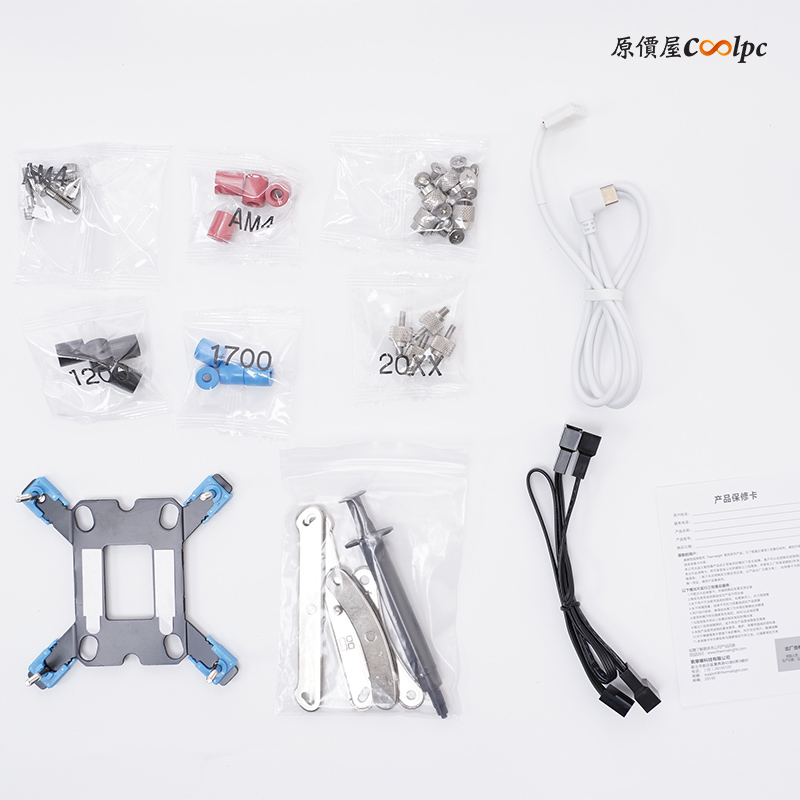 配件支援 Intel 115x/1200/1700、AMD AM4/AM5 腳位處理器專屬支架、螺絲,內附一條風扇一轉二的線材,四個固定風扇扣具。