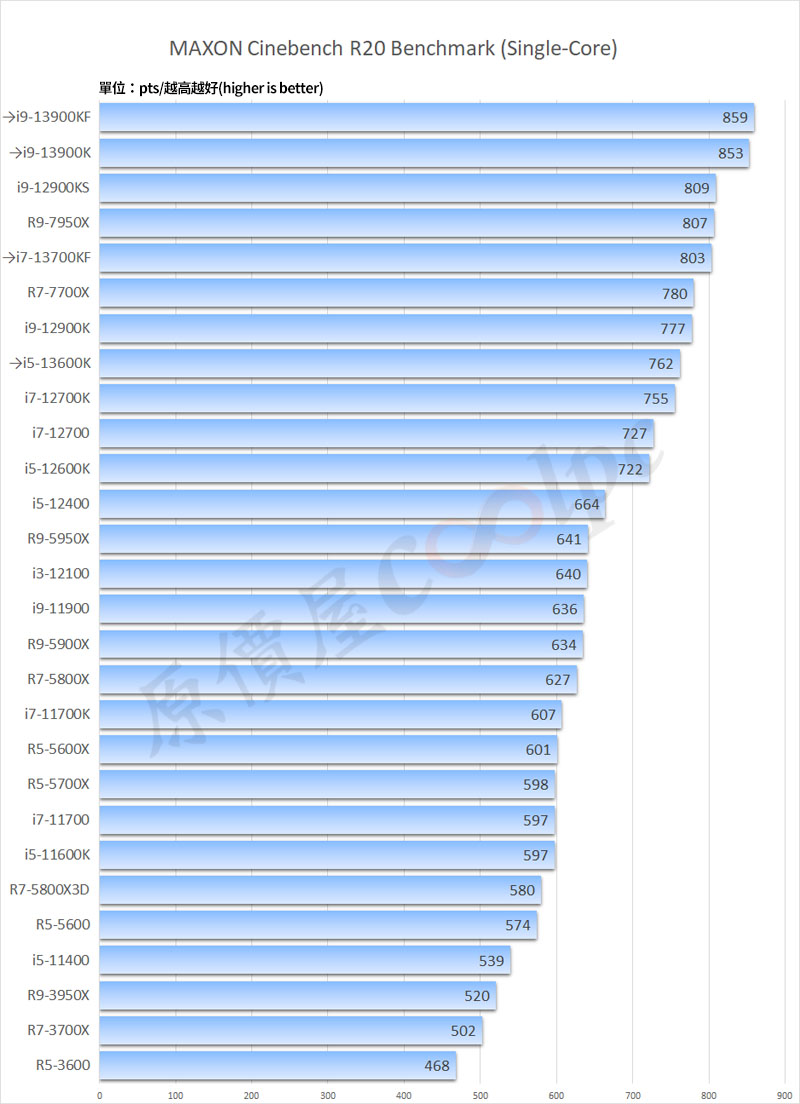 CINEBENCH R20/R23 主要測試 CPU 渲染性能,測試效能數字越高越好,怎麼說呢…AMD 驕傲的 Ryzen 7000 這次給 Core i9-13900K 超車過去了,連 i5-13600K 也有突破性的效能提升,這種超車來超車去的效能,就是我們要的血流成河ㄚㄚㄚㄚ!