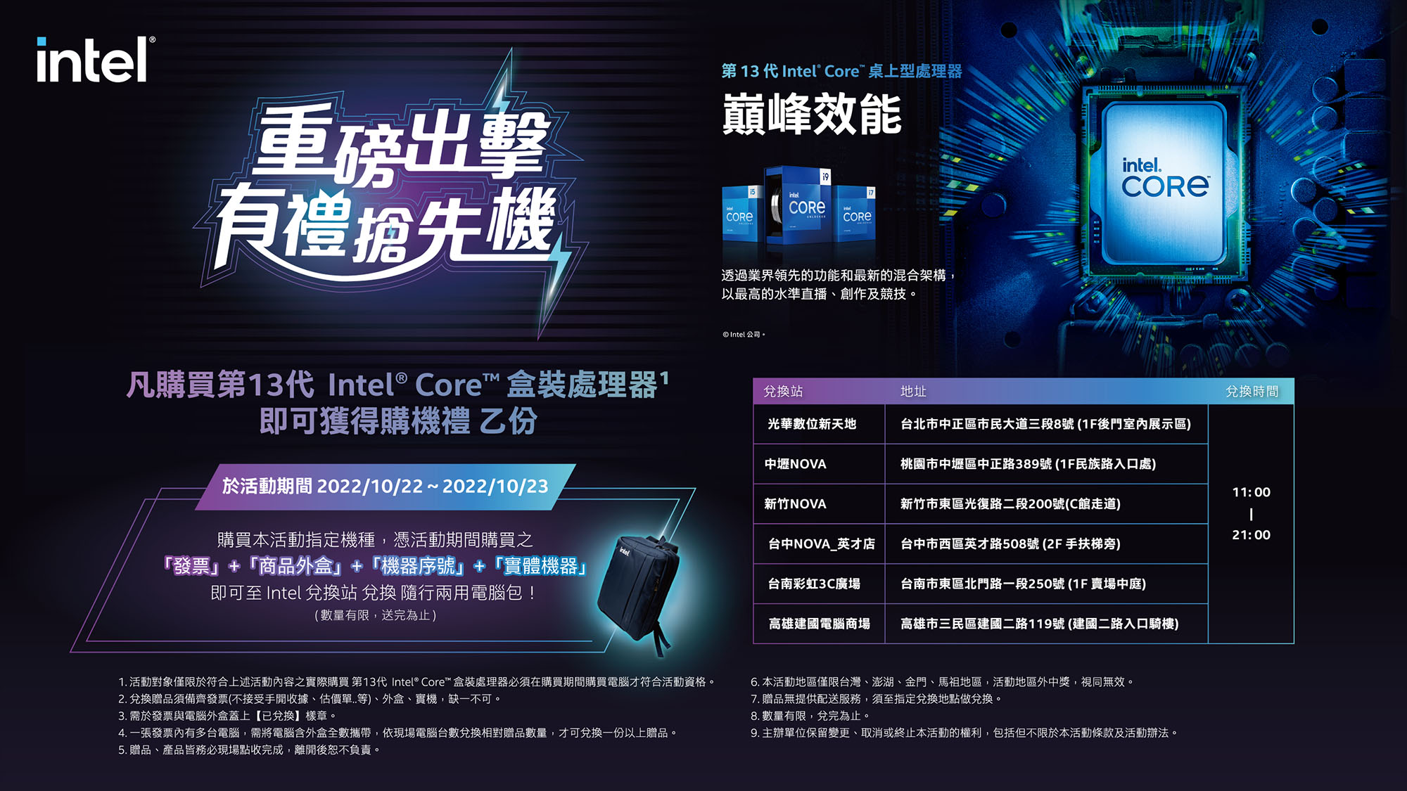 ↪憑處理器發票+外盒,可至 Intel 兌換站換取電腦包(限時限量 10/22~10/23 止)