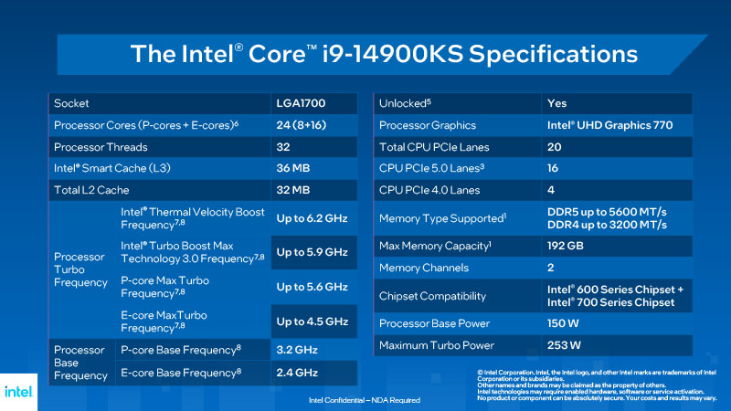 技術部分與當時 Intel Core 處理器(第 14 代)上市時提到的相同,像是 Intel Application Optimization 最佳化技術、具備 AI Assist 的 Intel Extreme Tuning Utility(XTU)超頻工具。i9-14900KS 規格資訊為 8 P-core(3.2↑6.2GHz) + 16 E-core(2.4↑4.5GHz)組成 24 核 32 緒,提供 L2(32MB)+L3(36MB) cache、PBP 150W(MTP 253W),一樣搭載 Intel UHD Graphics 770 內顯晶片,與 i9-14900K 相比主要是 P-core TVB 時脈及基礎功耗上的差異,其餘 cache、PCIe 5.0、DDR4/DDR5 規格皆相同!