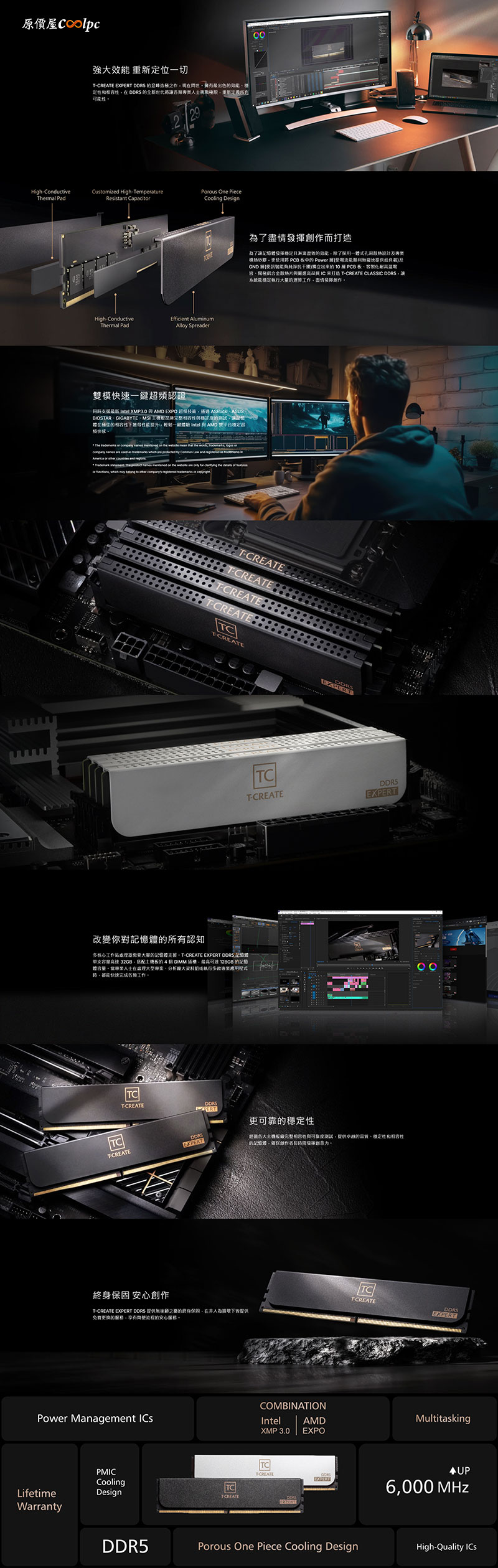 十銓 T-CREATE EXPERT 引領者 24GB 是非二進制 DDR5 記憶體,擁有 6000MHz 時脈與 CL28 時序,完美支援 AMD EXPO & Intel XMP 3.0 雙平台一鍵超頻技術,為確保極致的超頻效能穩定運作,特別搭載專屬散熱裝甲,頂部的散熱孔洞設計能有效引導熱氣向上排出。外觀採用低調內斂的磨砂材質,捨棄浮誇造型,讓整體質感大幅提升!這次還有高顏值的白色款式讓你輕鬆搭配純白主機,加量不加價,並享有非人為損壞終身保固。