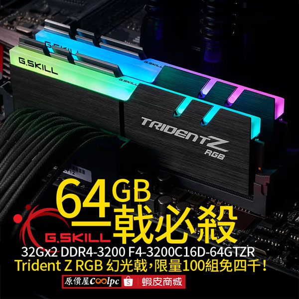 活動內容:芝奇 G.SKILL 幻光戟 64GB 雙通黑銀 (32GB*2 DDR4-3200 CL16 F4-3200C16D-64GTZR) 終保,$4790 ↘ 門市$3990(蝦皮購買 $4090)