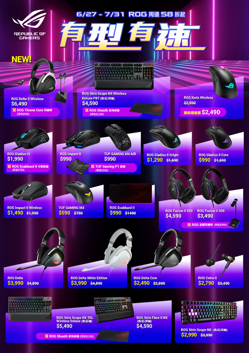 我真的需要那個酷東西啦!華碩ROG推出這麼多又酷又潮的電競周邊,沒一樣入手怎麼行啊~快點趁這次7月暑假的華碩限時限量活動衝一波吧!活動內容包括了近期才剛推出ASUS ROG Delta S Wireless無線耳機,還有多把機械式鍵盤、滑鼠以及耳麥產品,有的折價有的送贈品,整檔活動通通都有驚喜~絕對是你為ROG信仰增值的最好機會!