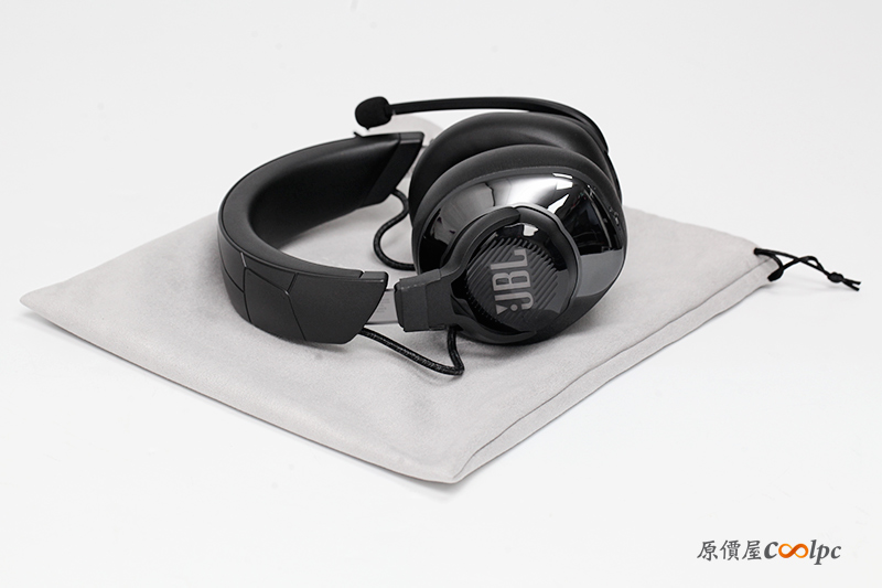 大大的 JBL LOGO 就壓在耳罩上方,這邊也先告訴各位,只要你將耳機接上電源,這個 JBL LOGG 就能發出漂亮的RGB藍色燈光!