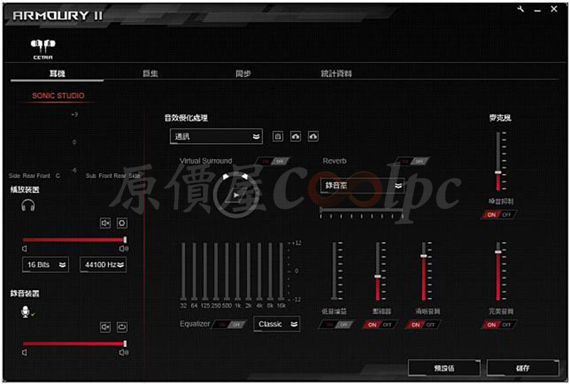 在驅動軟體Armoury的部分也可以細調音量、EQ、虛擬7.1聲道、音效優化等多樣設定。