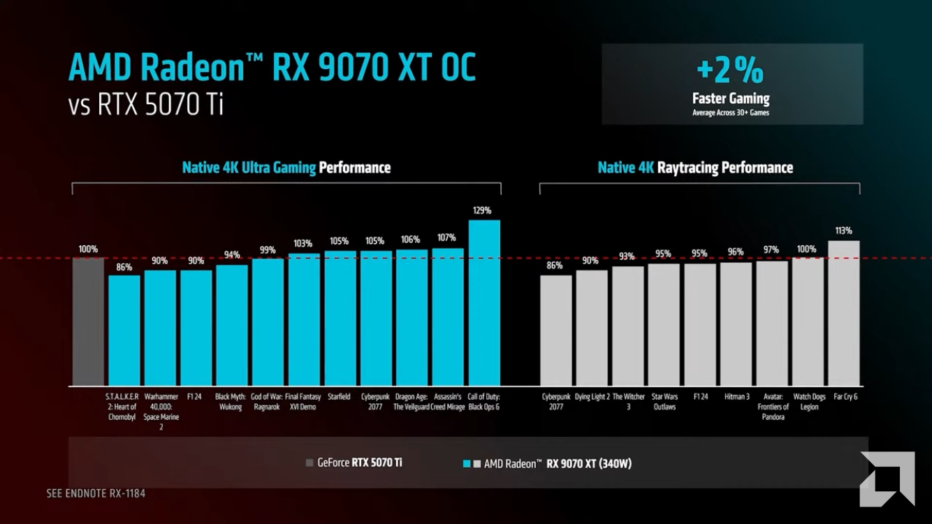 效能上能超越 NVIDIA GeForce RTX 5070 與 RTX 5070 Ti 的表現,連小編也振奮不已!根據 AMD 官方數據顯示,RX 9070 XT OC 版本在 4K 原生與光追效能上領先 RTX 5070 Ti 高達 2%,展現出強大的競爭力,進一步搭配 AMD 頂尖的 FSR 4 技術,其性能更可與 NVIDIA 的 DLSS 4 相媲美,令人非常期待!
