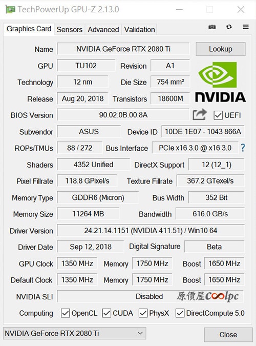 跑分測試前先來看一下顯示卡的GPU-Z規格吧!上圖為GPU-Z為ROG STRIX RTX2080Ti O11G黑色版本 記憶體採用美光 GDDR6顆粒,下方為ROG STRIX RTX2080Ti O11G White白色版,記憶體採用三星GDDR6顆粒,記憶體速度從14Gbps提升到14.8Gbps,BOOST超頻也提升至1740MHz,開啟OC模式可高達1770MHz,僅次於ROG MATRIX RTX2080TI P11G GAMING水冷版。