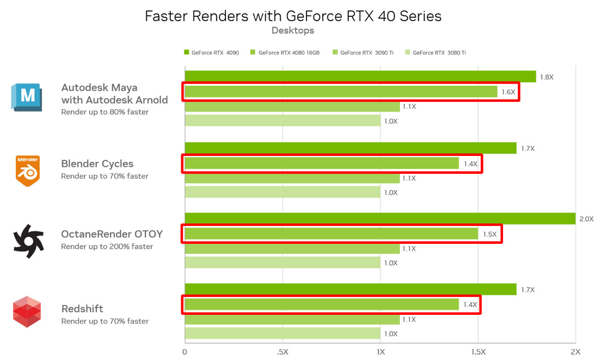 就連創作者應用軟體效能也是突破天際!NVIDIA GeForce RTX 4080都比 RTX 3090Ti/RTX 3080Ti效率還要好!