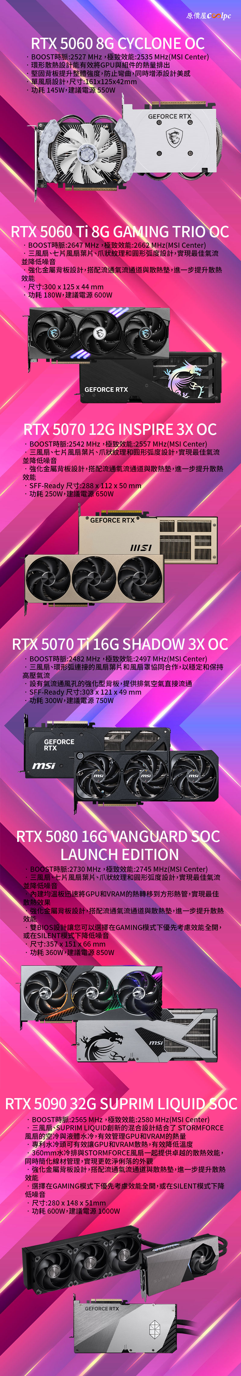 微星一出手,便知有沒有,即刻起只要在原價屋購買微星 RTX 5060 以上顯卡,不論規格型號還是已經促銷殺到見骨與否,都可以兩步驟回函索取1500點 Mycard 點數(500點×3)!趁遊戲開服前來原價屋挑一張顯卡,開服讓你爽爽 4K 畫質效能全開,好好欣賞遊戲內的場景!微星顯卡等級從入門到高階應有盡有,使用 1080p 解析度選 RTX 5060/5060TI 8G,2K 解析度選 RTX 5060Ti 16G/5070,4K 解析度秒選 RTX 5070Ti /5080/5090 準沒錯!顯卡除了 RTX 5090 之外,其他等級系列型號皆有一款白色的顯卡任你搭配,有興趣的朋友趕緊利用網路下單,或到門市做詢問,或利用蝦皮商城購買啦。