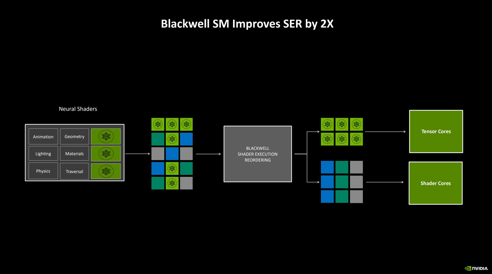 • 改進的串流多處理器(SM):具有更高的處理吞吐量,並與 Tensor 核心更緊密地集成,以優化神經著色器的效能。Blackwell 透過多項硬體和軟體創新得到增強,並改善 Shader Execution Reordering (SER) ,著色器執行排序邏輯的效率提升至兩倍,增加了重新排序的速度和精確度,從而加快了神經著色器的性能表現。