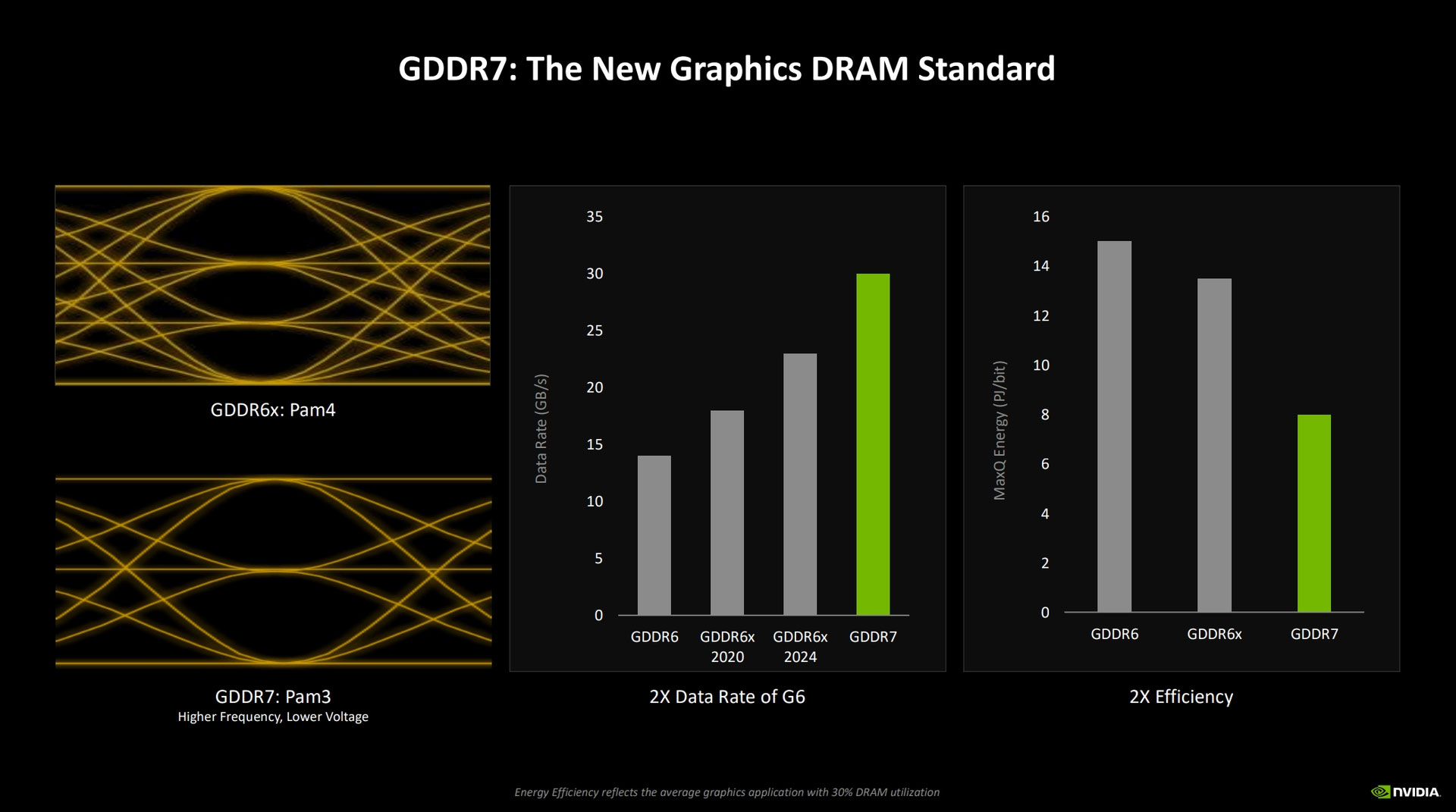 • GDDR7 記憶體:GDDR7 相較 GDDR6 多兩倍的頻寬,而且功耗只要一半,GDDR7 採用 PAM3 訊號技術,提高抗雜訊能力,允許在較低功耗下跑更高頻率,解決頻寬不足與高功耗的問題。