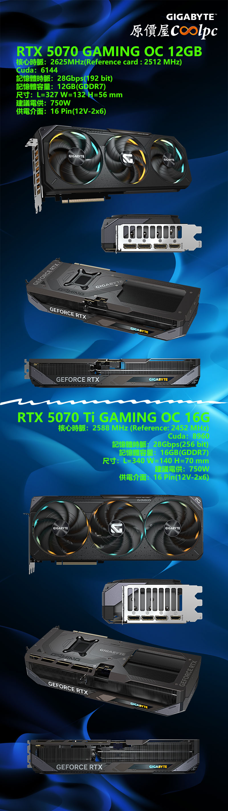 技嘉 RTX 5070 12GB/5070 TI 16GB GAMING OC 這兩張顯卡搭載 NVIDIA Blackwell 架構與最新的 DLSS 4 幀生成技術,讓遊戲體驗能夠更上一層樓,在規格上 RTX 5070 擁有 12GB 記憶體,滿足 2K 效能全開的首選;而 RTX 5070 Ti 擁有 16GB 記憶體,追求 4K 效能順玩級別。兩款型號均導入技嘉獨家 WINDFORCE 風之力散熱系統,結合 Hawk 風扇與正逆轉技術,即便在多人副本溫度保持低溫、穩定。三風扇還有獨家傳奇的三環發光燈效,提供絕佳的視覺享受,顯卡背後有強化金屬背板,強化結構防止板彎,還有雙 BIOS 模式、PCI-E 電源監控指示燈、可調式顯卡支撐架設計,提供 3 個 DP 2.1b、1 個 HDMI 2.1b 輸出介面,可同時四畫面輸出,保固上網註冊延長 3+2 年,有興趣的朋友趕緊利用網路下單,或到門市做詢問,或利用蝦皮商城下單。