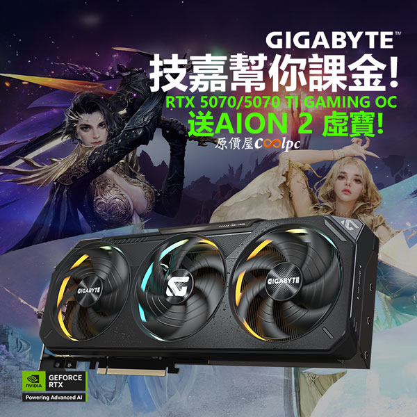 獻上價值 $2000元《AION2 》虛擬寶物!技嘉 RTX 5070 12GB /5070 TI 16GB GAMING OC 顯卡讓你《AION2》遊戲開局贏在起跑點!現在來原價屋購買指定型號顯卡,發票拍照回函索取,送價值$2000元的豪華遊戲虛擬寶物,數量有限,送完為止!技嘉 RTX 5070 12GB /5070 TI 16….