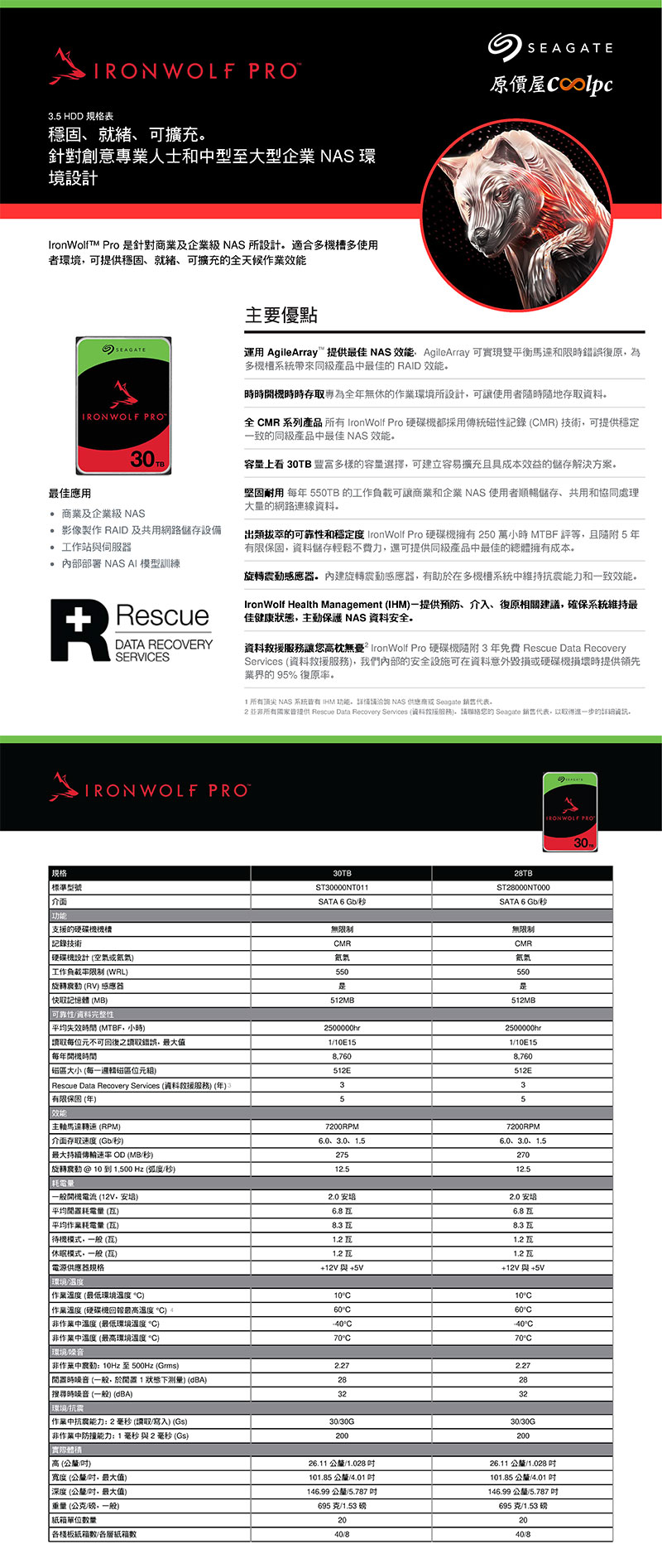 既然用作伺服器數據中心,硬碟的耐用度必須可靠穩定。希捷 IronWolf Pro 28TB/ 30TB 採用 CMR 技術和 AgileArray 技術(含雙平衡馬達、TLER、RV 感應器),確保 24 小時伺服器穩定運作,具備 512MB Cache、工作負載率(550TB/年)、250 萬小時平均故障間隔(MTBF)、7200 RPM 轉速及 275MB/s 最大傳輸速度,提供 IronWolf Health Management 硬碟監控,隨時掌握硬碟健康狀態!保固更是長達 5 年並享有 3 年 Rescue Data Recovery 服務(95%成功率)就是要你用得安心放心!歡迎有興趣的朋友可透過官網、門市諮詢或蝦皮商城輕鬆下單。
