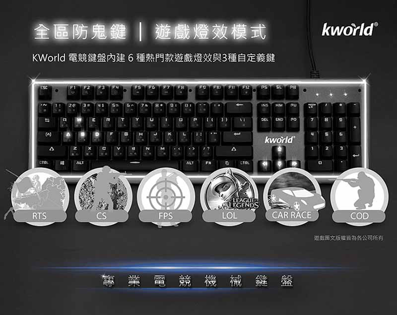 活動這支廣寰 C550 外型就是當前最受歡迎的極簡懸浮裸軸樣式,底部鈦灰色金屬底板邊緣還有CNC削邊處理,而且竟然是最高境界 Cherry MX 櫻桃青軸可真的是沒得嫌了!對了,還有白色的背光喔,原價屋現在只要1090元有沒有很離譜!不僅如此,基本FN+功能可是非常豐富的,包含實用快捷鍵(我的電腦、搜尋、計算機)、多媒體播放控制、音量調整快捷鍵,甚至還有防止屁孩亂入的全鍵鎖定鍵。燈光有內建11種動態模式!電競功能還有WASD跟方向鍵互換、鎖定win鍵、還有全鍵防鬼鍵按鍵不衝突呢! Kworld 廣寰已經滿老牌了,當初用三隻小龍龍的標誌可被大家酸慘了(說到這兒就有印象了吧!),不過廣寰產品真心不錯的啊,另外就是服務也好所以可說CP值爆高呢。現在C550這價格完全就是要在暑期打入各位玩家的心,1090元的櫻桃白光太誇張啦~。本檔僅限門市自取,原價屋全台門市有現貨喔!(數量有限,門市售完為止囉!)