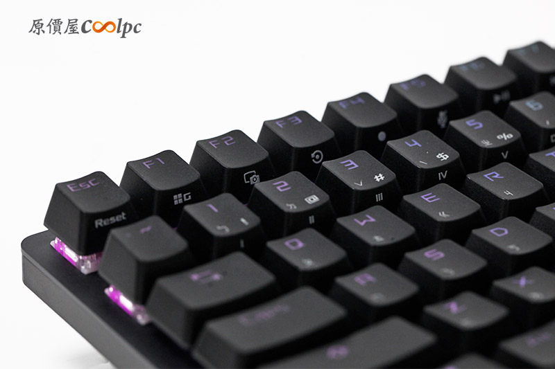 鍵帽除了有標準的中英字在上方外,側刻的部分也標示了鍵盤擁有的多媒體功能,像是RGB燈光的亮度以及模式調整,還有鎖Win鍵與Macro巨集鍵的功能。