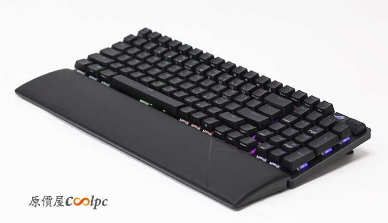 所以內容物。除了鍵盤與收納套外,配件部分也相當的豐富,像是有著磁吸式的手托,還有編織連接線與轉接頭,另外也附上了拔鍵軸器以及一個可替換空白鍵的特色鍵帽,當然也有說明手冊與ROG的超精美貼紙啦!