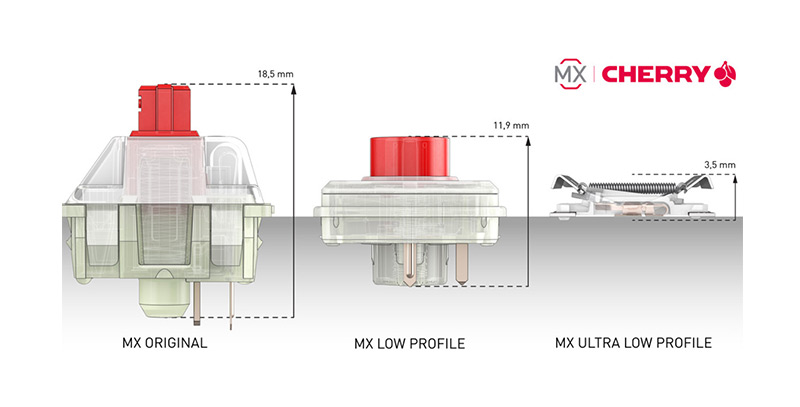 Cherry MX Ultra Low Profile tactile 觸覺開關特性、65 cN 操作力、0.8毫米預行程、1.8 毫米總行程。