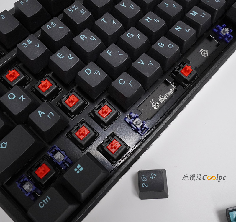 二色成形鍵帽,是利用雙重結構鑲嵌顯現,所以字符永久不會被磨掉。更繁瑣的是O型不破孔的完美工藝,讓外觀更好看。而 Ducky 鍵盤所使用的PBT材質都是高純度的,市面上有一些純度只有5%的也是稱之為PBT鍵帽。不過得用上一陣子看看會不會出現表面光滑打油 (表示不夠耐磨),才看的出來純度。