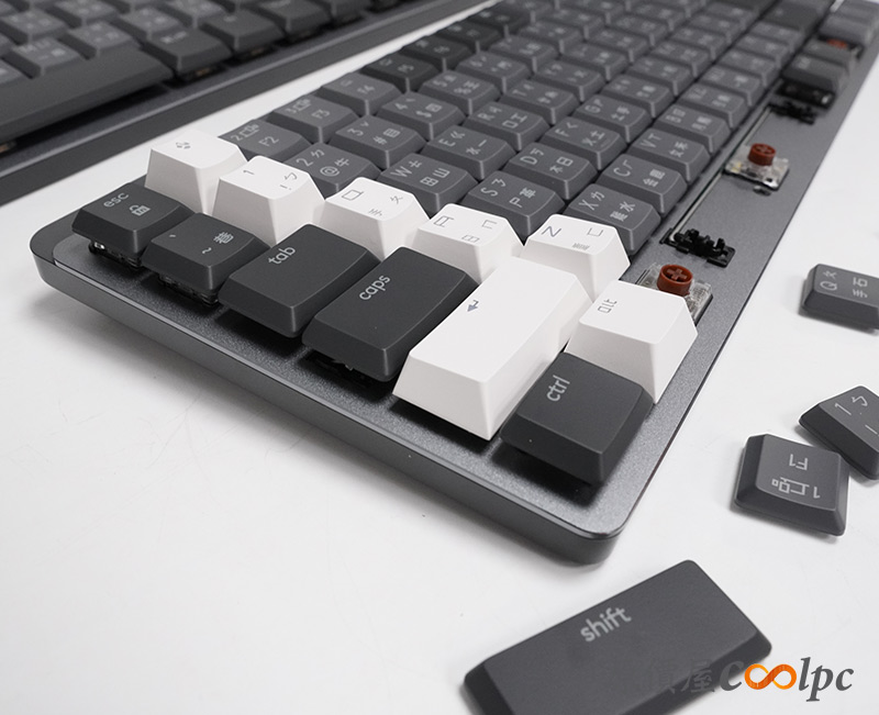 採用凱華的矮軸而且是十字軸唷,一般薄型鍵帽其實都可以相容,試過OEM高度就會卡住,而Cherry原廠高度則可以使用。