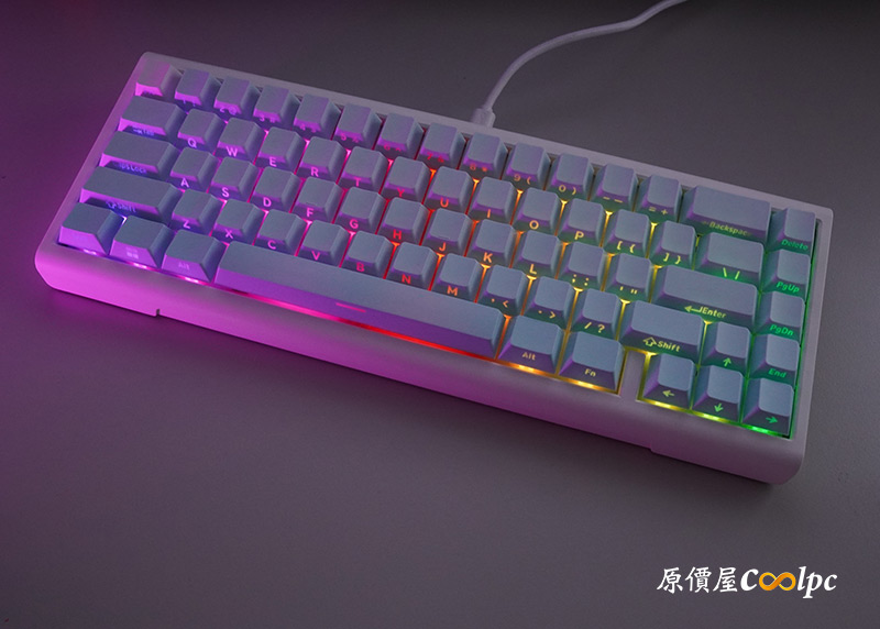 PBT材質鍵帽,即便側刻不需要管是否耐磨,同樣用上了二色成行透光的製程,非常好看!