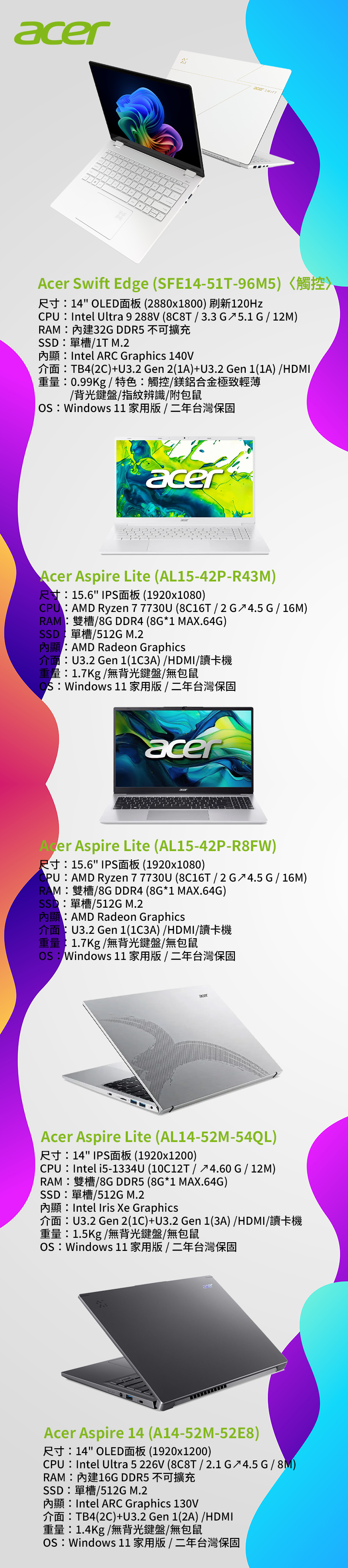 這次活動的守備範圍非常廣,從主打高 CP 值的入門首選 Aspire Lite、Aspire 5,再到質感與效能兼具的 Swift GO、Swift 14 甚至是大螢幕的 Swift 16 通通都有!如果你是平常需要背著電腦跑客戶的商務人士,或是只需要流暢處理文書作業的小資族,這些系列絕對是首選。特別是 Swift 系列致輕盈的體驗,真的會讓你肩膀壓力減輕不少,再加上現在多了一年保固防護,等於是幫筆電買了份價值 $3000 元的全險,未來幾年都不用再擔心意外發生啦~如果你正好在尋找一台穩定、耐用且售後保障滿分的工作夥伴,歡迎到全台原價屋門市走走逛逛,或是到原價屋線上估價系統及原價屋蝦皮商城下訂唷!