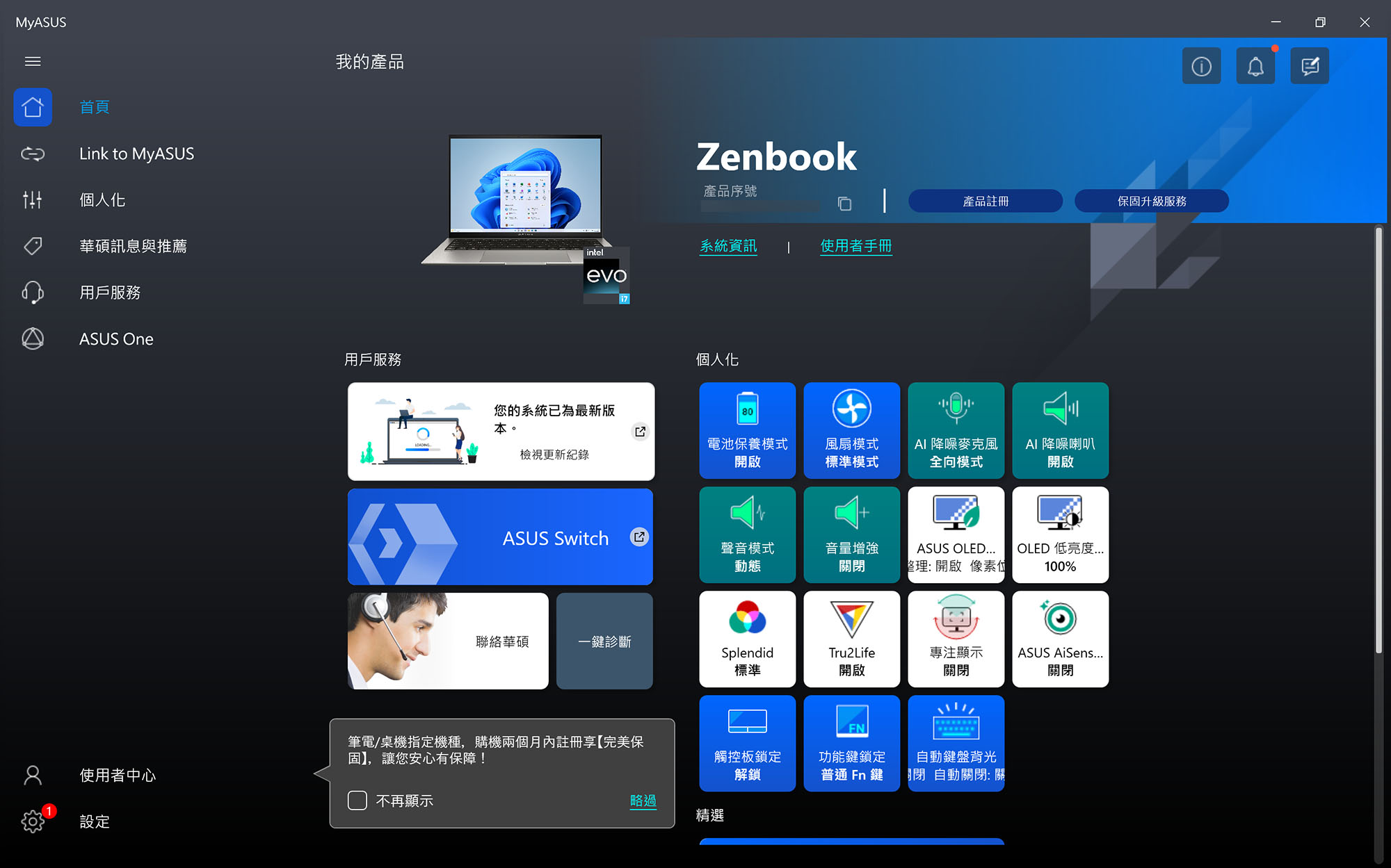 註冊保固、檢視重大更新、充電模式設定、OLED 螢幕保護等功能都在此,主頁面亦有提示記得於購買兩個月內註冊獲得第一年「完美保固」。