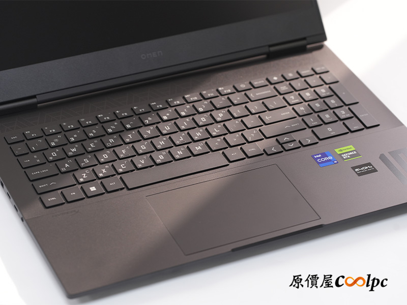 C面板採用鋁合金設計,鍵盤為 100 鍵孤島式,包含右邊的數字鍵、小算盤、OMEN GAMING HUB 快捷鍵等,支援多組 FN+快捷鍵功能與四區背光,各位還能在 OMEN GAMING HUB 自行調整鍵盤色彩與功能唷。