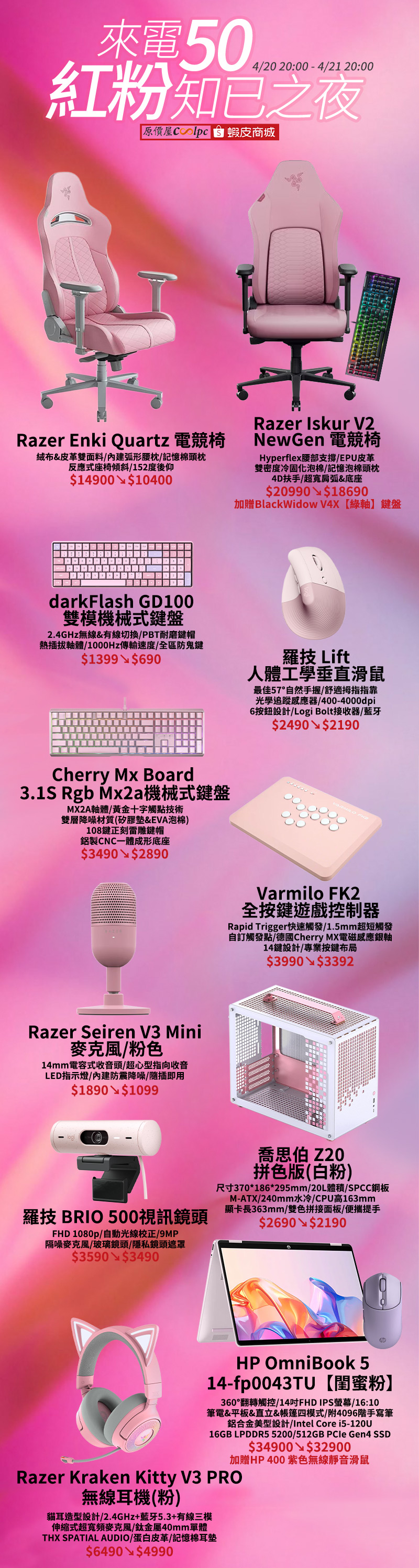 粉色周邊的愛好者一直都不少,這回原價屋特別幫各位整理起來,給大家一次粉紅爆擊!先來一張Razer Enki Quartz電競椅,將整個椅面都做成粉色,視覺效果超級強,且椅子本身絨布皮革雙面料,內建弧形腰靠與記憶棉頭枕,舒適度絕對不在話下,這張也是今晚優惠最多的商品,足足便宜了四千五!接著再戴上Razer Kraken Kitty V3 PRO無線耳機,頭帶上的貓耳是招牌,粉色則是讓萌度更上層樓,還有2.4GHz、藍牙、有線三模連線,THX SPATIAL AUDIO帶來身歷其境的音效。鍵盤就配經典德國櫻桃Cherry Mx Board 3.1S RGB Mx2a粉,享受MX2A軸體帶來的絕佳手感,鋁製CNC一體成形底座經得起激烈對戰考驗。如果想要壓低預算就看DarkFlash大飛GD100(粉色),不用一千就能買到2.4GHz+有線雙模,全區防鬼鍵設計,鍵帽還是耐用的PBT,這樣價位很划算啊。玩格鬥遊戲要特別推一款Varmilo FK2全按鍵遊戲控制器,Rapid Trigger模式+1.5mm超短觸發,幫助你用極致速度擊潰對手。甚至你可以幫主機換個新家,有COUGAR FV150 RGB、幾何未來Model 5悟空兩種海景房機殼,或是喬思伯Z20極具藝術感的拚色機殼,當然他們都是粉色的。想找粉色筆電這次也有!看是要999g超輕量的美型機ACER SFL14-54M-73E9【幻境粉】,或是可以360°翻轉觸控的HP OmniBook 5 14-fp0043TU【閨蜜粉】。另外還有粉色麥克風、粉色視訊鏡頭、粉色滑鼠、粉色喇叭,各式各樣的粉色等著你,下面幫大家依照商品種類條列出來,喜歡就把它們帶回家吧。