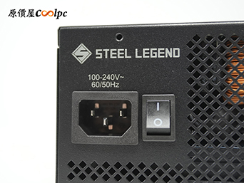 電源散熱網孔中央配有金屬 Steel Legend 標誌,下方搭載 135mm FDB 液壓軸承風扇,兼顧散熱效率與外觀辨識度。