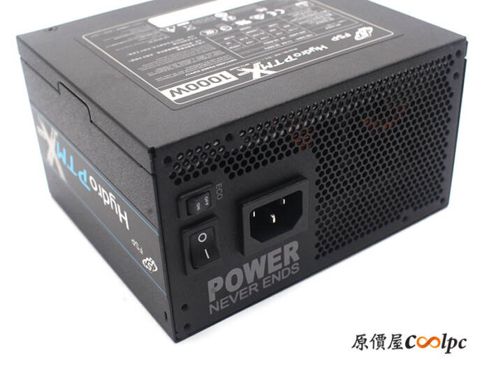 電源後端有大面積散熱孔設計,除了一般的翹板開關外,還提供 ECO Mode 切換開關,ECO 啟動後可將風扇將切換成智慧型溫控模式,負載低於 30% 保持風扇靜止狀態,超過 30% 則啟動風扇。
