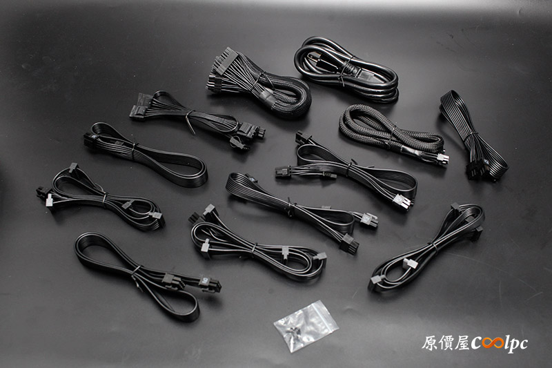 而這次線材附的相當豐富,主線為 24+4Pin,擁有 CPU 4+4Pin x 1、PCIe 5.0 電源線 x 1(12VHPWR,單條提供 600W)、6+2 Pin PCIe x 3、SATA每條4個 x 3,以及大4Pin x 1。也附上了一組電供安裝螺絲。