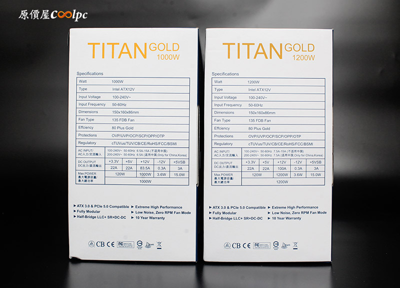 精緻的彩盒包裝,可以看到正面有著電供的實品圖,左上角則是這次的型號「TITAN GOLD」,雖然瓦數不同,但電供的體積是同樣的大小設計,上方還有80PLUS金牌、Cybenetics Gold 雙認證,原廠10年保的標章。