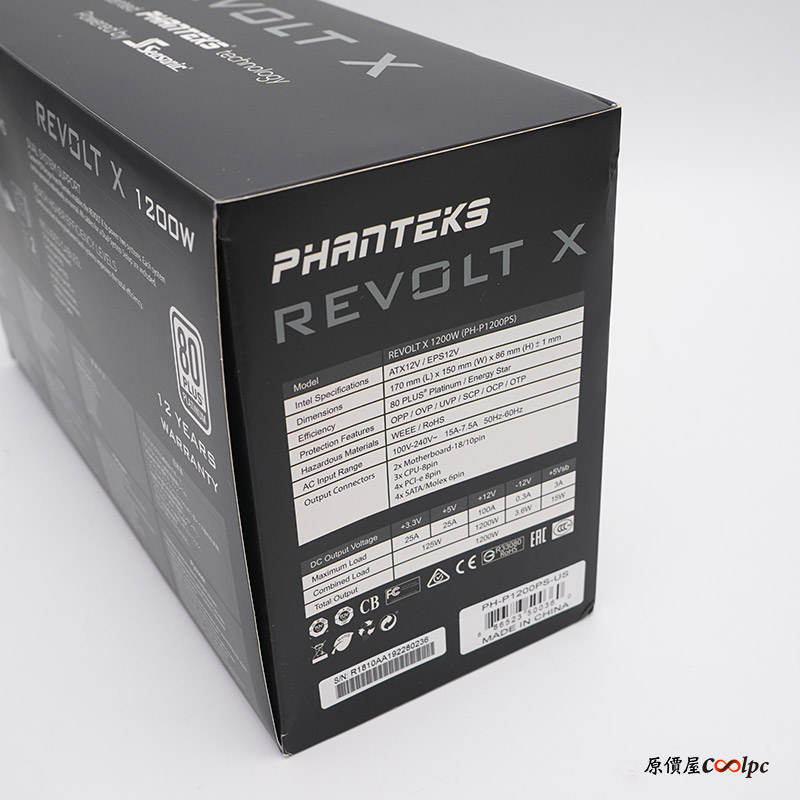 電源供應器上方可以看到電源供應器序號、型號(PH-1200PS)、輸出瓦數以及能源轉換效率等級以及多項檢測標誌,+12V部分提供100A,最高能夠輸出1200W,+3.3V及+5V 分別提供25A,合計最高輸出125W。