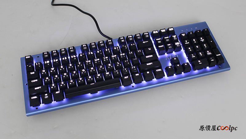 放大點給各位瞧瞧,軸體實際上是青軸,而按鍵不衝突這應該是現在機械鍵盤的標配了,尺寸14.7X44.5X3.8公分,大小算是滿適中的,重量大約1.06公斤,拿起來還算有重量不會輕易滑動。