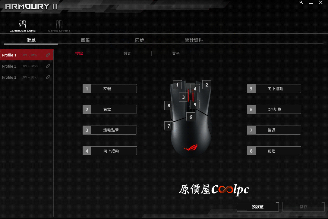 官網下載驅動,下載後名為ROG Armoury II (軍械庫2),是整合型驅動面板。首頁即可看到分為「按鍵」、「效能」、「背光」。左邊可以看到 Profile1/2/3 可以直接由滑鼠按鍵切換。設定檔可自訂不同燈光,甚至連接應用程式!定義鍵預設中有「滑鼠功能」、「鍵盤單鍵」、「多媒體」、「windows捷徑」、「巨集」可以直接選用。