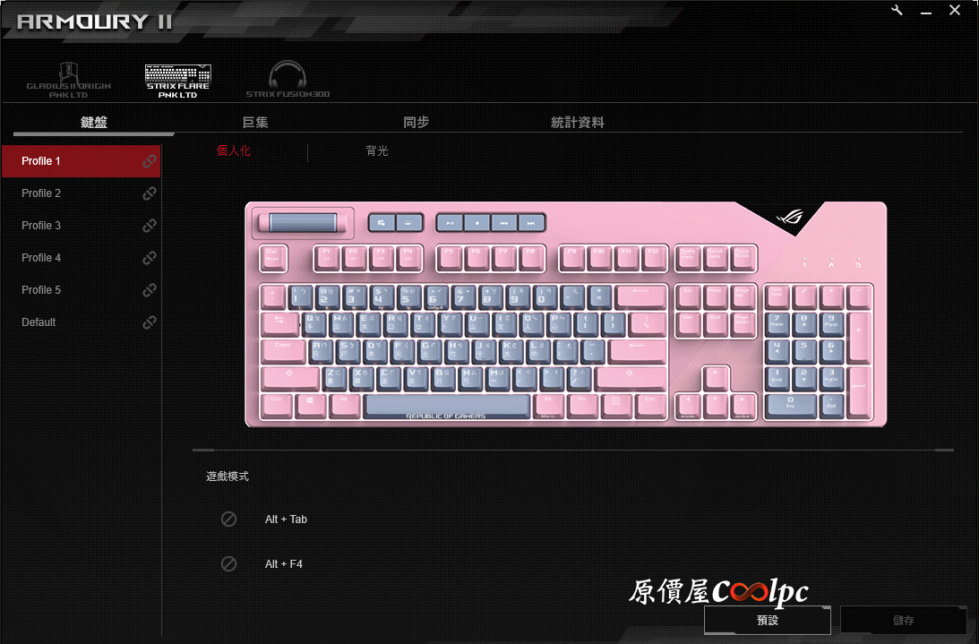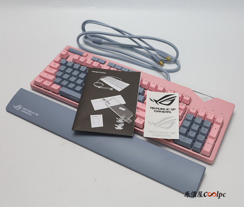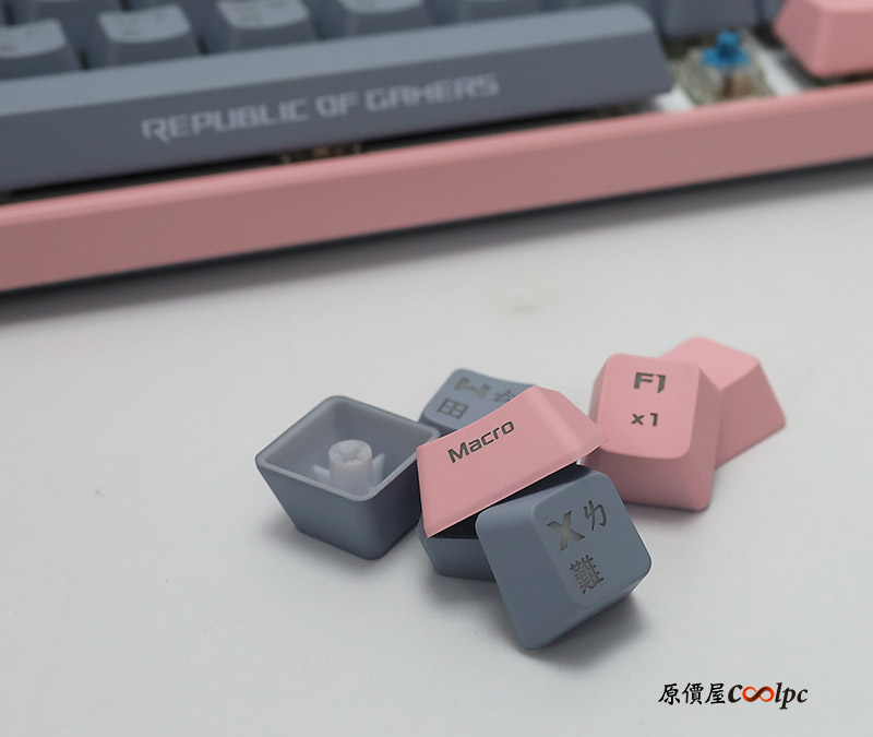 ASUS ROG STRIX FLARE RGB PNK 機械式電競鍵盤/青軸,有AURA SYNC RGB燈光。右上方的壓克力透光板是鍵盤的亮點!