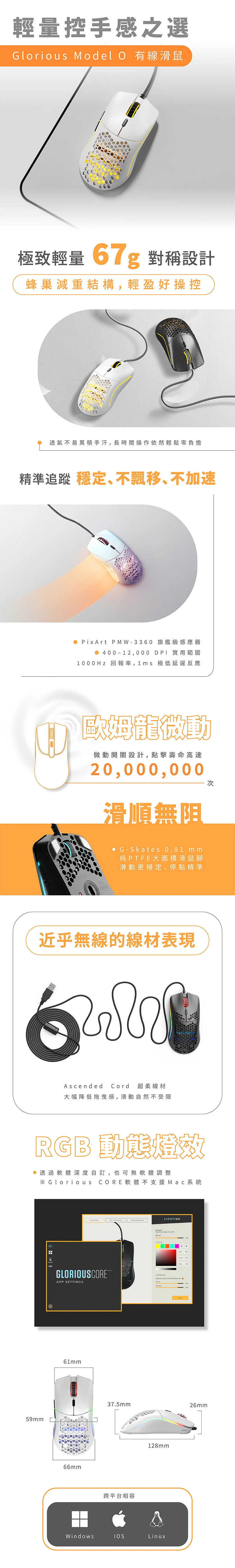 Glorious Model O 電競滑鼠(白)/有線/PWM3360/12000Dpi/輕量化/編織線/Rgb, $1690↘$990