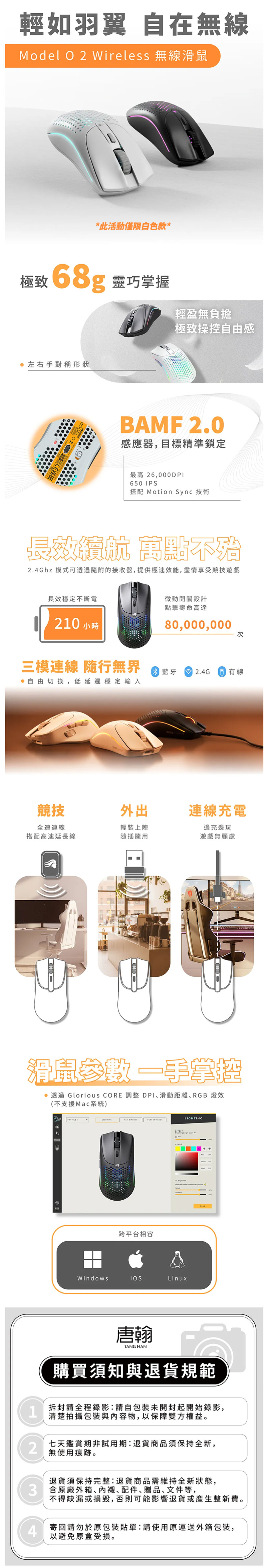 這次價格漂亮只是第一步,真正讓玩家愛上的還是它的規格與手感。「Glorious Model O2 Wireless」主打 68g 超輕量設計,在電競滑鼠領域屬於輕量級選手,移動與甩槍時能減少手腕負擔,對於 FPS 玩家來說特別有感,長時間遊戲也不容易疲勞。在核心性能方面,它搭載 BAMF 2.0 光學感測器,最高可達 26,000 DPI,同時具備 650 IPS 追蹤速度與 50G 加速度,搭配 1000Hz 回報率,滑鼠移動的精準度與穩定度都相當優秀。不論是《CS2》這類需要精準瞄準的射擊遊戲,還是需要快速操作的 MOBA 類型,都能提供順暢可靠的操作體驗。連線部分則採用 Hybrid 雙模無線設計,提供低延遲的 2.4GHz 無線模式,以及便利的 Bluetooth 5.2 連線。想要打遊戲就用 2.4GHz 追求低延遲,日常辦公或筆電使用則可以切換藍牙模式,一顆滑鼠就能應付多種裝置情境。電池續航力也很驚人,在 2.4GHz 模式下可達 約 110 小時,藍牙模式更可達 210 小時,續航焦慮幾乎不存在。細節部分同樣到位,使用 80M 次點擊壽命的按鍵開關,搭配 100% PTFE G-Skates 滑鼠腳貼,讓滑動更加順暢。加上 RGB 燈效與可透過 Glorious CORE 軟體調整設定,從 DPI、回報率到按鍵配置都能客製化,打造最符合自己操作習慣的滑鼠設定。總結來說,這次的優惠真的很香~原本屬於中高階定位的無線電競滑鼠,現在直接下殺到 $1990,還加送價值 $690 的磁吸硬殼收納包。對於想入手輕量化無線滑鼠、或是準備升級電競裝備的玩家來說,這波幾乎就是便宜買滑鼠順便撿到贈品的概念啊!