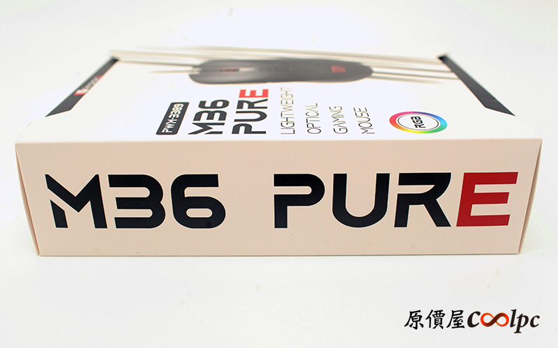 彩盒的包裝設計,除了有中央的滑鼠圖片外,一旁就是這次滑鼠的型號名稱「M36 PURE」!也可以看到這次採用的感應器為PWM3389,也具備RGB燈效!