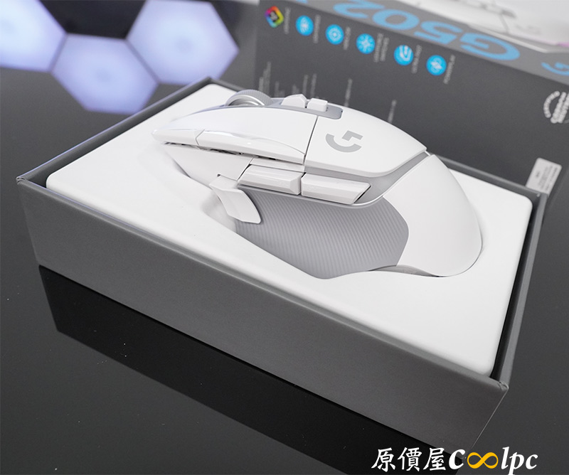 這價格是該用精品展示的貢著!蓋子一打開可真是令人驚豔,還是那個我最愛的 G502,竟然他還真的出了心心念念的白色款!