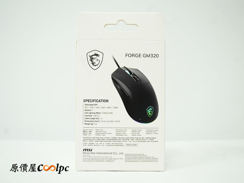 接下來是 GM320 電競滑鼠,外盒也是純白配色配上龍盾 LOGO 的簡單風格,背面則是滑鼠的規格介紹。