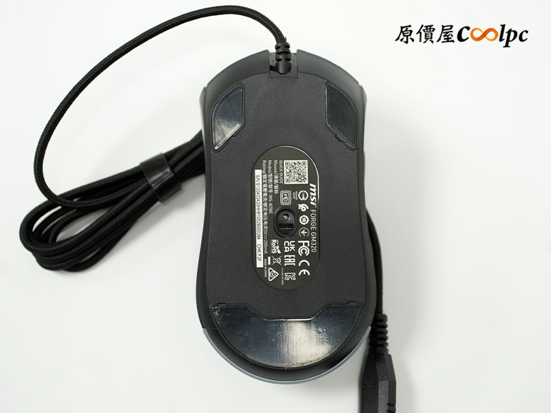 下方貼有三大片鐵氟龍鼠貼,使用前記得移除保護膜唷。中間光學感測器最高支援 12,800 DPI 靈敏度、高速 1000Hz 輪詢率,周圍貼紙則是產品 S/N 序號。