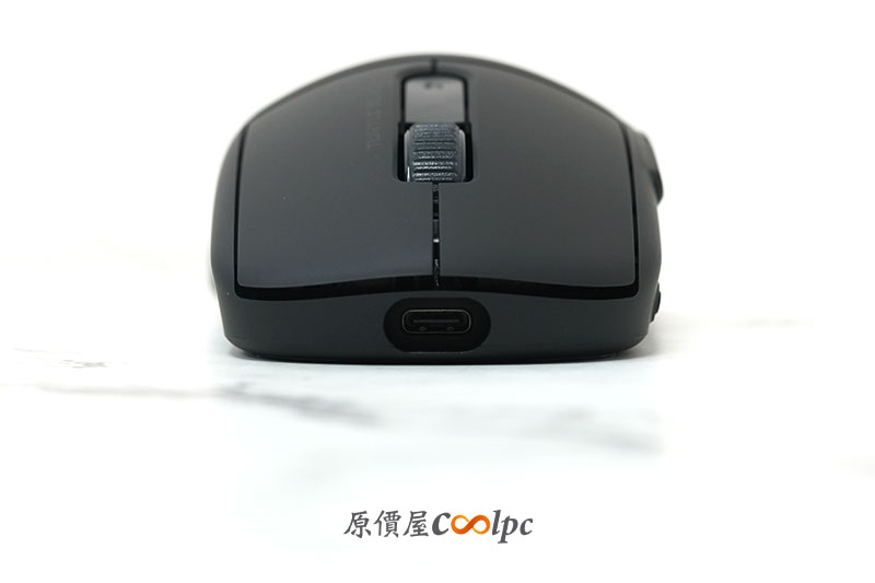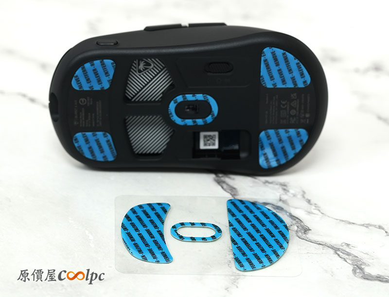 滑鼠底部採用 PTFE 腳貼,提供滑順移動體驗,並支援更換不同尺寸腳貼配置,讓玩家可依照滑動習慣調整手感。另外也有設置 USB 接收器的收納凹槽。